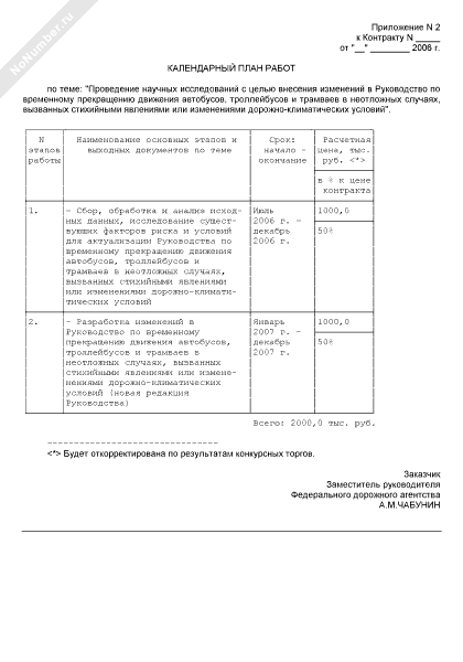 - 96Календарный план работ (приложение к государственному контракту на выполнение НИОКР (поставку готовой научно-технической продукции по теме: «Проведение научных исследований с целью внесения изменений в Руководство по временному прекращению движения автобусов, троллейбусов и трамваев в неотложных случаях, вызванных стихийными явлениями или изменениями дорожно-климатических условий»))