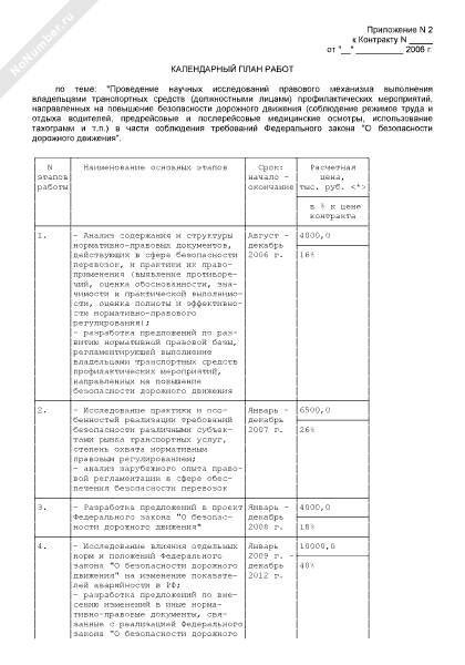 Календарный план работ (приложение к государственному контракту на выполнение НИОКР (поставку готовой научно-технической продукции по теме: «Проведение научных исследований правового механизма выполнения владельцами транспортных средств (должностными лицами) профилактических мероприятий, направленных на повышение безопасности дорожного движения (соблюдение режимов труда и отдыха водителей, предрейсовые и послерейсовые медицинские осмотры, использование тахограмм» и т.п.))