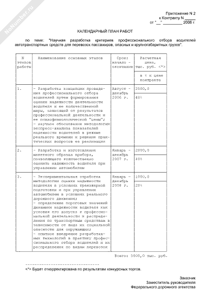 Календарный план работ (приложение к государственному контракту на выполнение НИОКР (поставку готовой научно-технической продукции по теме: «Научная разработка критериев профессионального отбора водителей автотранспортных средств для перевозок пассажиров, опасных и крупногабаритных грузов»))
