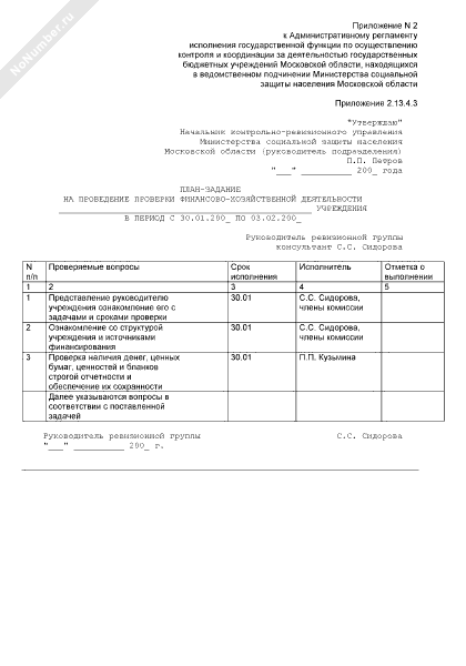 Образцы и типовые формы документов, сформированные в результате исполнения государственной функции по осуществлению контроля и координации за деятельностью государственных бюджетных учреждений Московской области. План-задание на проведение проверки финансово-хозяйственной деятельности учреждения (рекомендуемый образец заполнения)