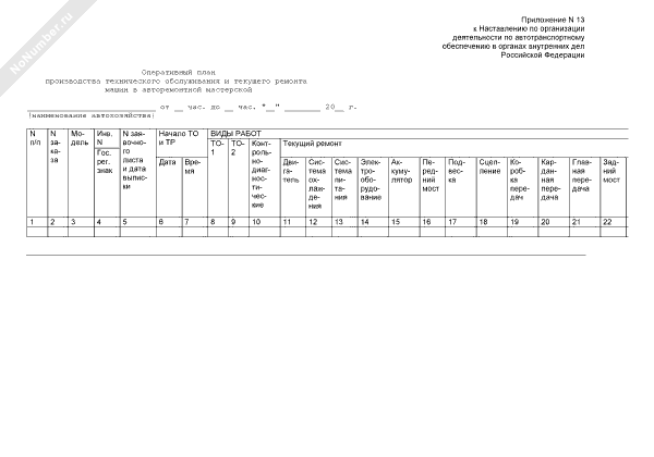 Оперативный план производства технического обслуживания и текущего ремонта машин в авторемонтной мастерской автотранспортного подразделения органов внутренних дел (рекомендуемый образец заполнения)