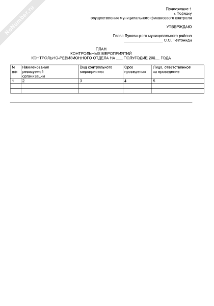 План контрольных мероприятий контрольно-ревизионного отдела Луховицкого муниципального района Московской области (рекомендуемый образец заполнения)