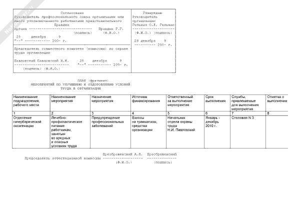 План (фрагмент) мероприятий по улучшению и оздоровлению условий труда в организации (рекомендуемый образец заполнения)