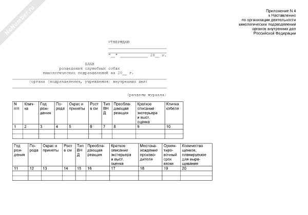 План разведения служебных собак кинологических подразделений (рекомендуемый образец заполнения)