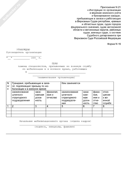 План замены специалистов, призываемых на военную службу по мобилизации и в военное время (форма № 16)
