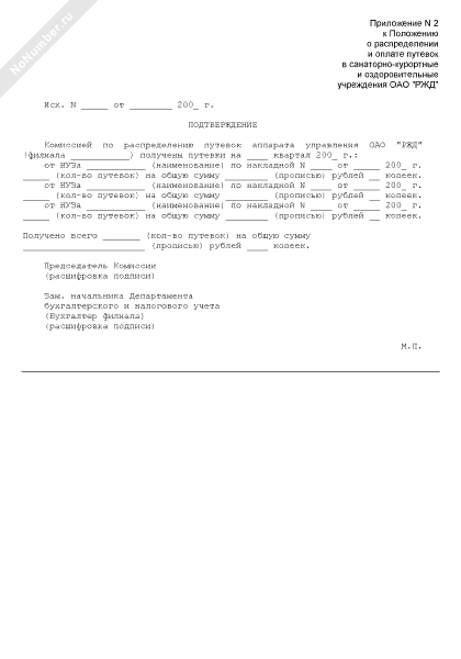 - 20Подтверждение о выделении путевок в санаторно-курортные и оздоровительные учреждения ОАО «РЖД»