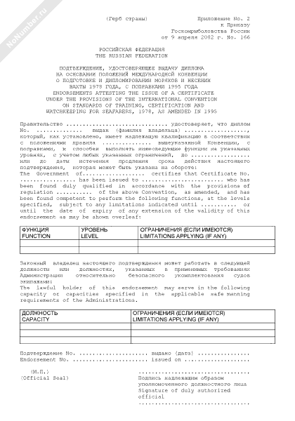 - 29Подтверждение, удостоверяющее признание диплома на основании положений международной Конвенции о подготовке и дипломировании моряков и несении вахты (рус./англ.)