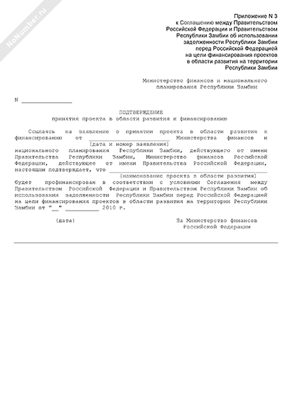 Подтверждение принятия проекта в области развития к финансированию (приложение к соглашению между Правительством Российской Федерации и Правительством Республики Замбии об использовании задолженности Республики Замбии перед Российской Федерацией на цели финансирования проектов в области развития на территории Республики Замбии)