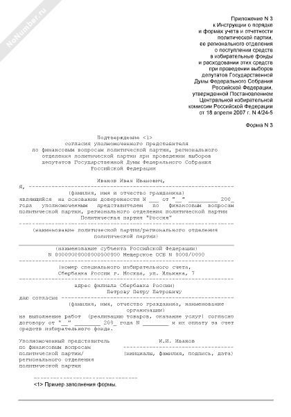 Подтверждение согласия уполномоченного представителя по финансовым вопросам политической партии, регионального отделения политической партии при проведении выборов депутатов Государственной Думы Федерального Собрания Российской Федерации (форма № 3)