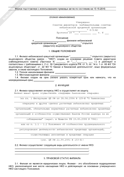 Положение о филиале небанковской кредитной организации, созданной в форме акционерного общества (рекомендуемый образец заполнения)