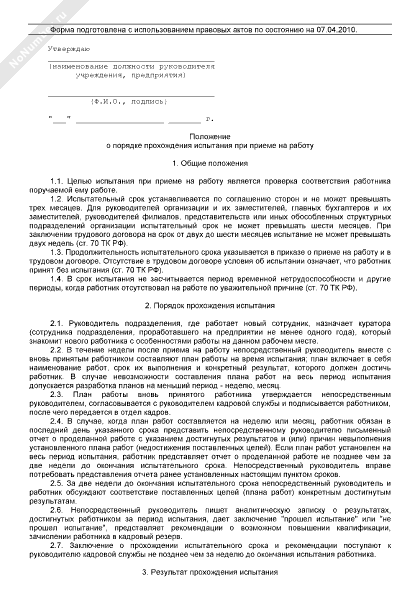 Положение о порядке прохождения испытания при приеме на работу