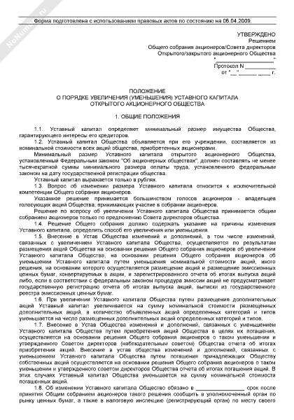 Положение о порядке увеличения (уменьшения) уставного капитала открытого акционерного общества