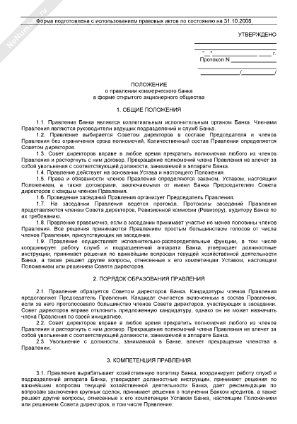 Положение о правлении коммерческого банка в форме открытого акционерного общества (рекомендуемый образец заполнения)