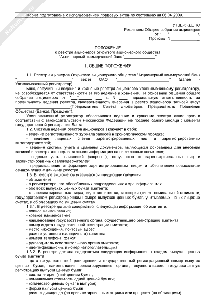 Положение о реестре акционеров открытого акционерного общества (акционерного коммерческого банка)