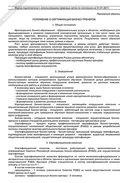 Положение о сертификации бизнес-тренеров (рекомендуемый образец заполнения)
