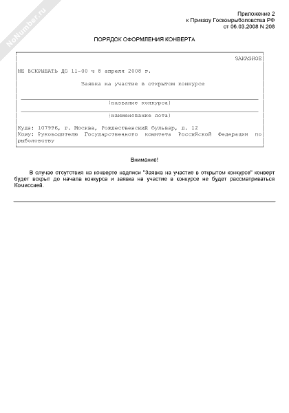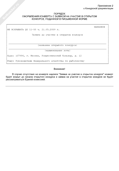- 49Порядок оформления конверта для заявки на участие в открытом конкурсе на выполнение работ по воспроизводству водных биологических ресурсов в 2008 году для государственных нужд