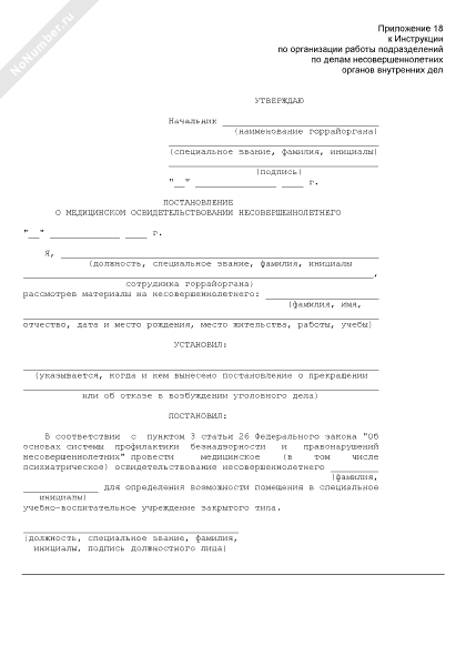 Постановление о медицинском освидетельствовании несовершеннолетнего для определения возможности помещения в специальное учебно-воспитательное учреждение закрытого типа (рекомендуемый образец заполнения)