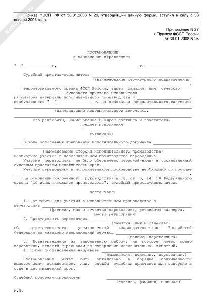 Постановление о назначении переводчика в структурном подразделении территориального органа Федеральной службы судебных приставов (рекомендуемый образец заполнения)