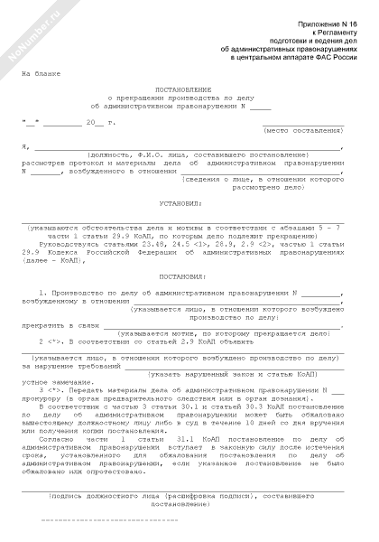 Постановление о прекращении производства по делу об административном правонарушении (рекомендуемый образец заполнения)