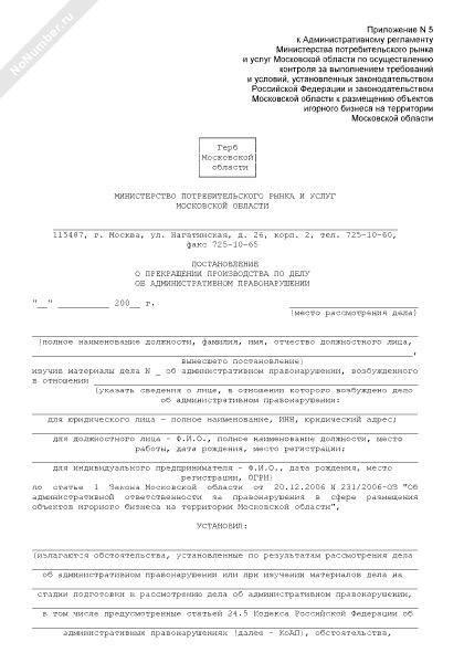 Постановление о прекращении производства по делу об административном правонарушении за нарушение требований и условий, установленных к размещению объектов игорного бизнеса на территории Московской области (рекомендуемый образец заполнения)