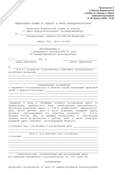 Постановление о прекращении производства по делу об административном правонарушении в сфере природопользования и охраны окружающей среды (рекомендуемый образец заполнения)