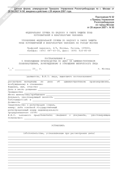 Постановление о прекращении производства по делу об административном правонарушении, возбужденному в отношении физического лица в сфере защиты прав потребителей и благополучия человека по городу Москве (рекомендуемый образец заполнения)