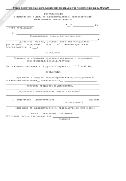 Постановление о приобщении к делу об административном правонарушении вещественных доказательств (рекомендуемый образец заполнения)