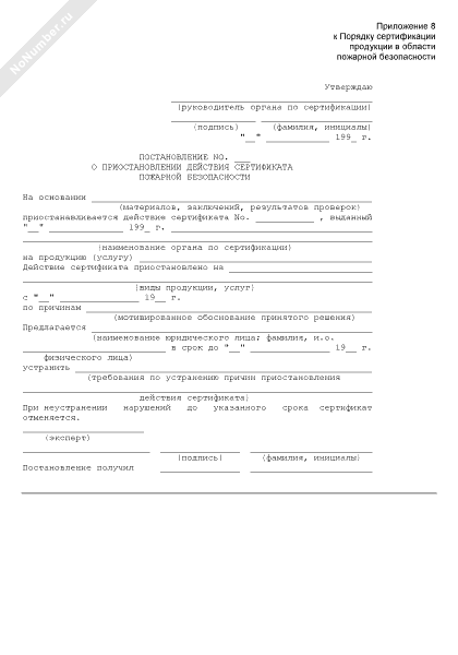 Постановление о приостановлении действия сертификата пожарной безопасности (рекомендуемый образец заполнения)
