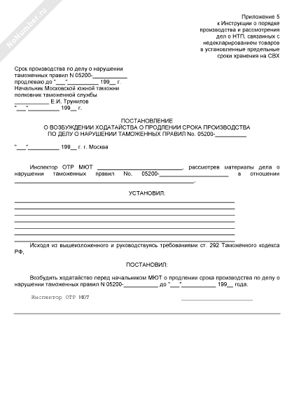 Постановление о возбуждении ходатайства о продлении срока производства по делу о нарушении таможенных правил (рекомендуемый образец заполнения)
