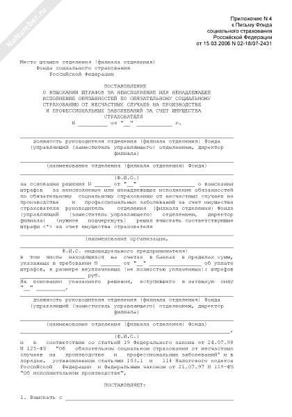 Постановление о взыскании штрафов за неисполнение или ненадлежащее исполнение обязанностей по обязательному социальному страхованию от несчастных случаев на производстве и профессиональных заболеваний за счет имущества страхователя (рекомендуемый образец заполнения)