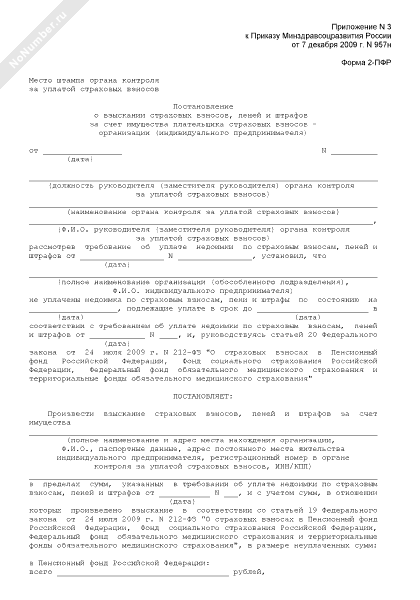 Постановление о взыскании страховых взносов, пеней и штрафов за счет имущества плательщика страховых взносов — организации (индивидуального предпринимателя). Форма № 2-ПФР