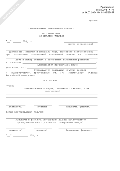 Постановление об изъятии товаров при проведении таможенной ревизии