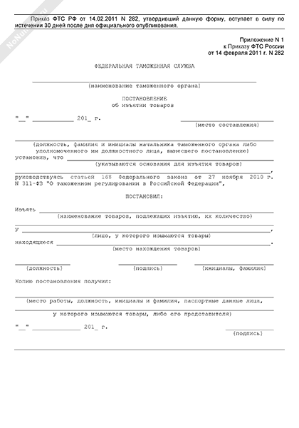 - Источник– Приказ ФТС РФ от 14.02.2011 № 282