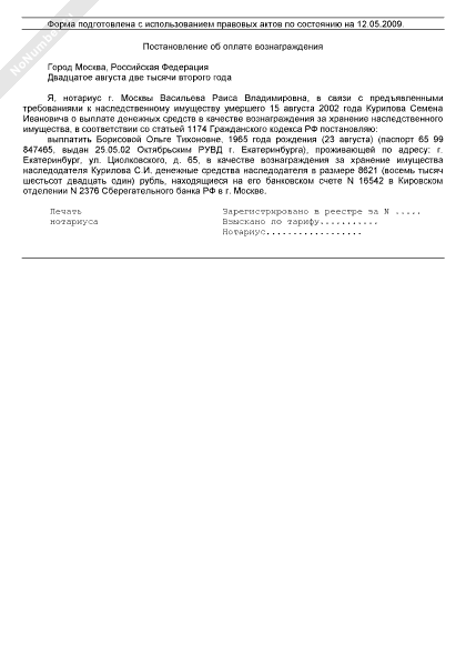 Постановление об оплате вознаграждения за хранение наследственного имущества (рекомендуемый образец заполнения)