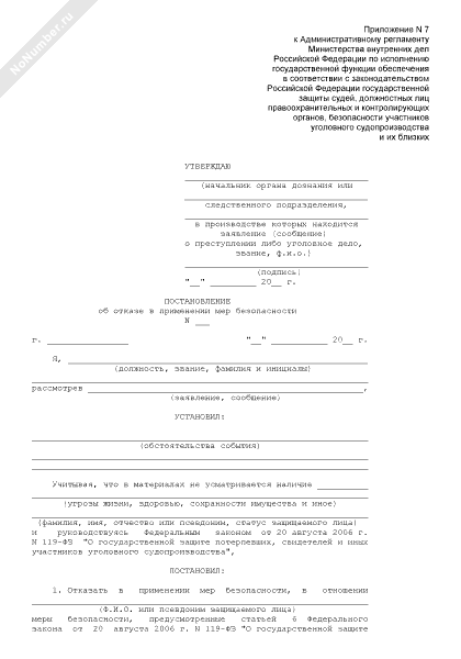 Постановление об отказе в применении мер безопасности в отношении участников уголовного судопроизводства и их близких (рекомендуемый образец заполнения)
