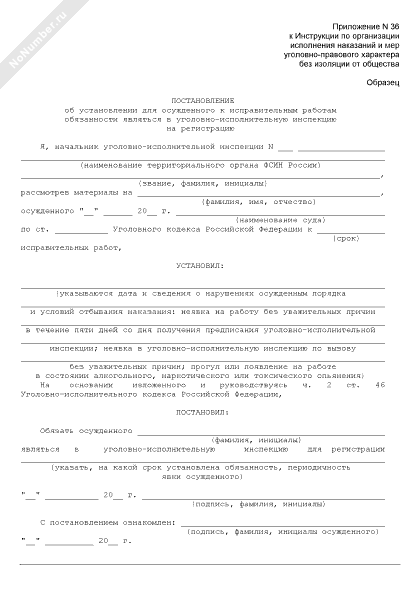 Постановление об установлении для осужденного к исправительным работам обязанности являться в уголовно-исполнительную инспекцию на регистрацию (рекомендуемый образец заполнения)