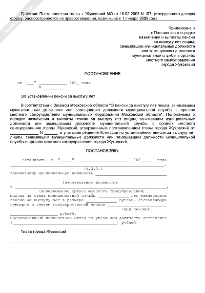 Постановление об установлении пенсии за выслугу лет лицам, занимавшим муниципальные должности в органах местного самоуправления города Жуковский Московской области (рекомендуемый образец заполнения)
