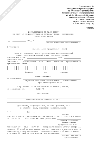 Постановление по делу об административном правонарушении, совершенном юридическим лицом, в области дорожного движения (рекомендуемый образец заполнения)