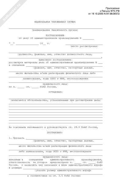 Постановление по делу об административном правонарушении в Федеральной таможенной службе РФ (рекомендуемый образец заполнения)