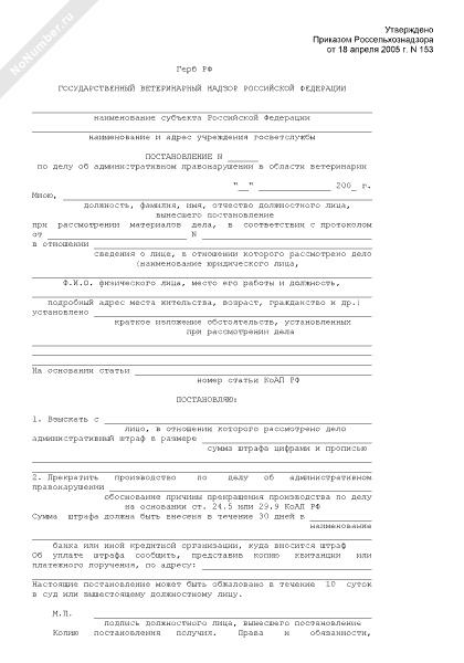 Постановление по делу об административном правонарушении в сфере деятельности Федеральной службы по ветеринарному и фитосанитарному надзору (рекомендуемый образец заполнения)