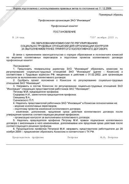 Постановление профсоюзного комитета об образовании комиссии по регулированию социально-трудовых отношений для организации контроля за выполнением ранее принятого коллективного договора (рекомендуемый образец заполнения)