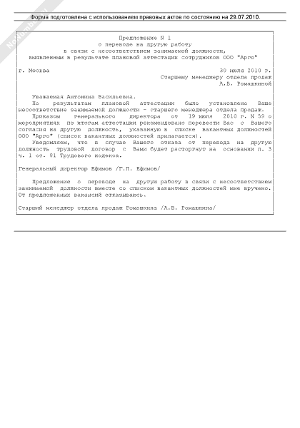Предложение о переводе на другую работу в связи с несоответствием занимаемой должности, выявленным в результате плановой аттестации сотрудников организации (рекомендуемый образец заполнения)
