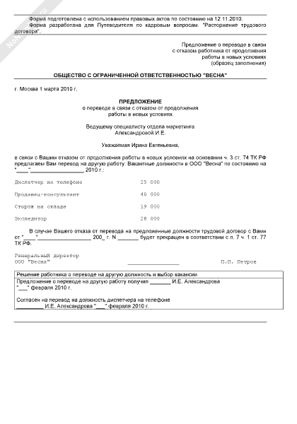 Предложение о переводе в связи с отказом работника от продолжения работы в новых условиях (рекомендуемый образец заполнения)