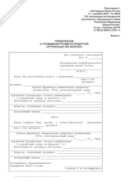 Предложение о проведении проверки кредитной организации (ее филиала) (форма № 1)