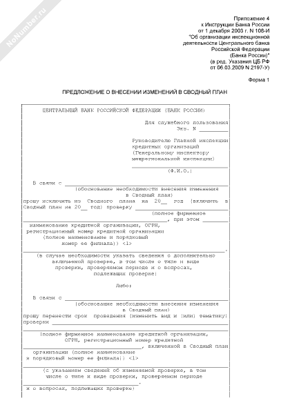Предложение о внесении изменений в сводный план проверки кредитной организации (форма № 1)