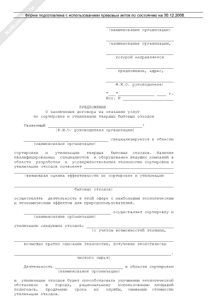 Предложение о заключении договора по сортировке и утилизации твердых бытовых отходов (рекомендуемый образец заполнения)