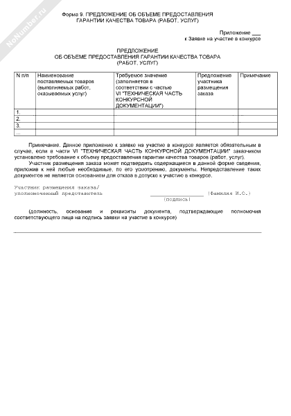 Предложение об объеме предоставления гарантии качества товара (работ, услуг) (приложение к заявке на участие в конкурсе на право заключения государственного контракта на поставки товаров, выполнение работ, оказание услуг для государственных нужд города Москвы) (форма № 9)