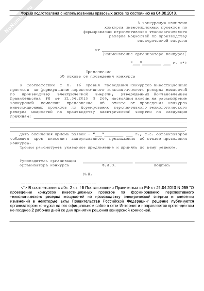 Предложение организатора конкурса инвестиционных проектов по формированию перспективного технологического резерва мощностей по производству электрической энергии об отказе от проведения конкурса (рекомендуемый образец заполнения)