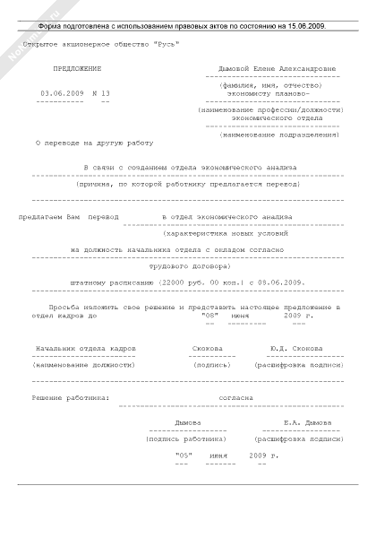 Предложение работнику о переводе на другую работу в связи с созданием в организации нового структурного подразделения (рекомендуемый образец заполнения)