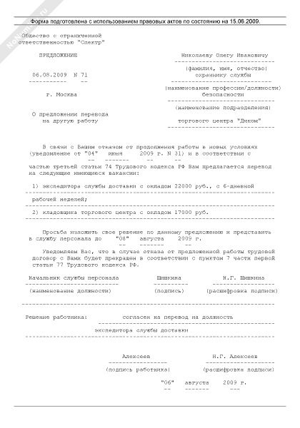 Предложение работнику, отказавшемуся от продолжения работы в новых условиях, о переводе на другую работу (рекомендуемый образец заполнения)